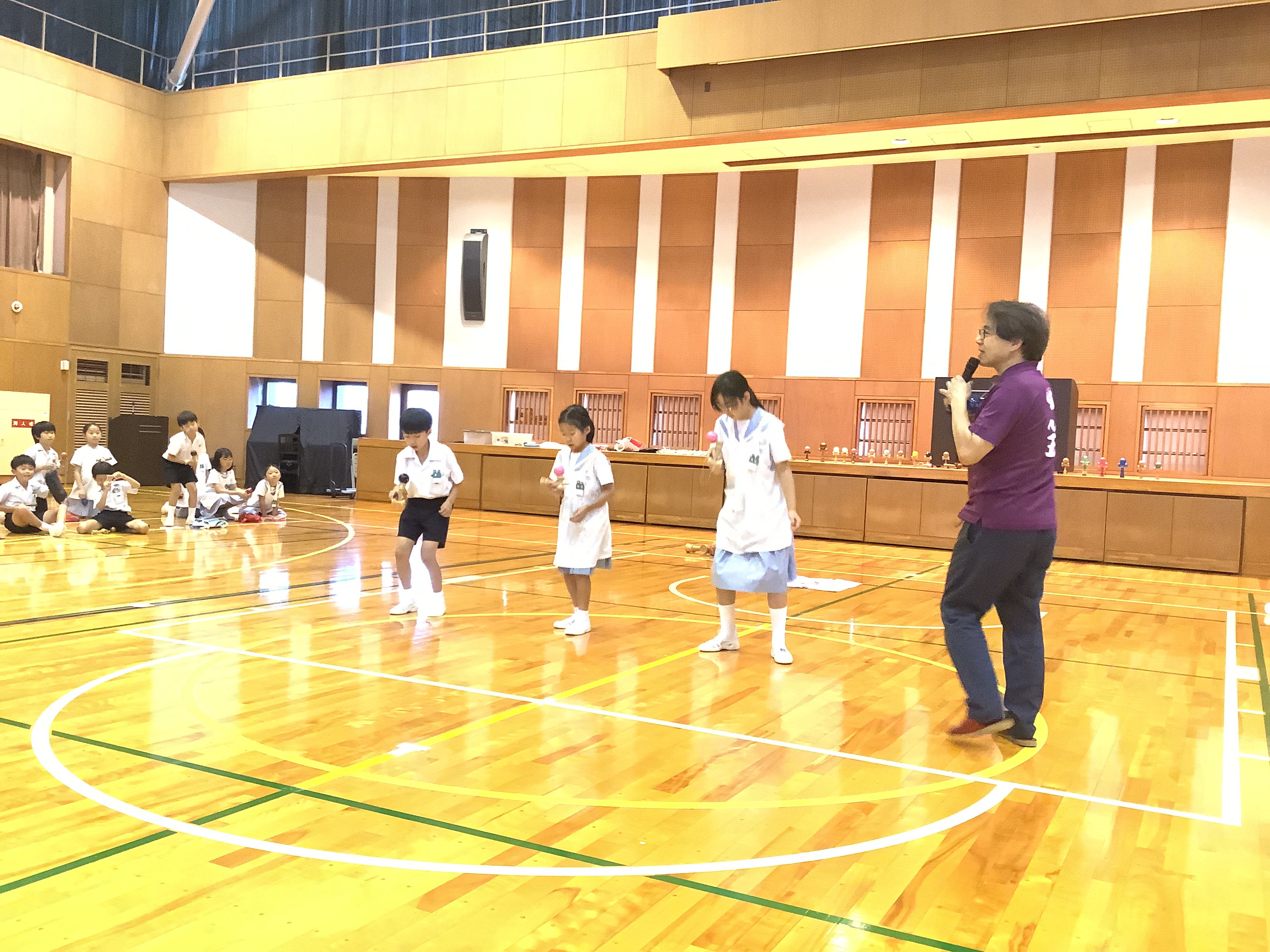 本日はけん玉名人である矢野博幸先生に来ていただき、けん玉を教えてもらいました。けん玉の歴史を学び、たくさんの技を教えていただきました。学んだ技に挑戦するけん玉検定は大盛り上がりでした。