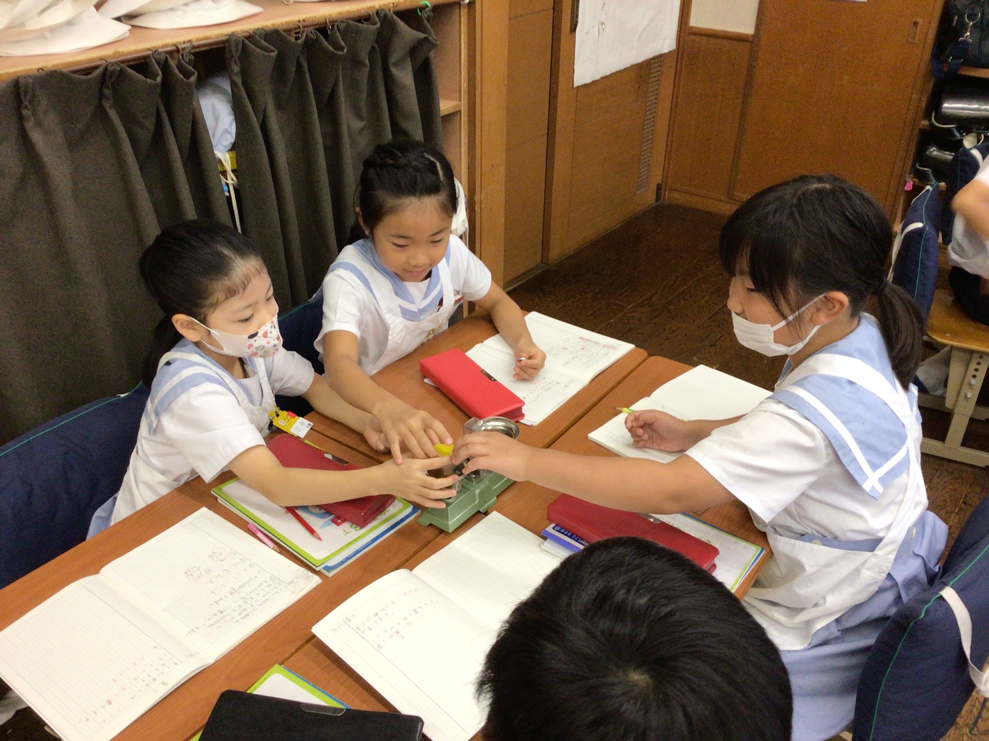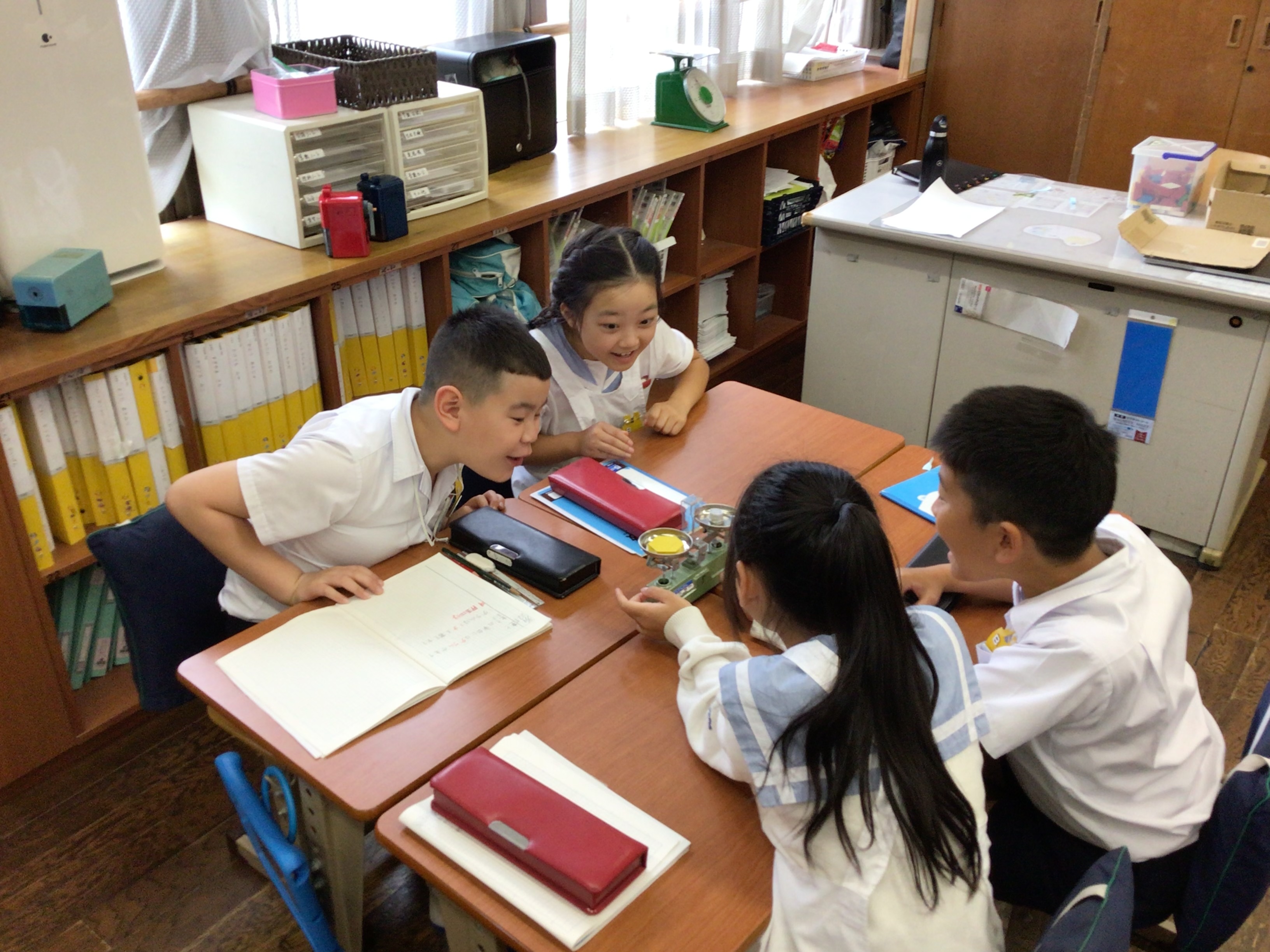2学期になり、それぞれの科目で新しい単元に入りました。 3年生の算数科では「重さ」の単元に入りました。 初めの授業では、1円玉を使い、ブロックの重さを天秤を使って、調べました。 それぞれのグループで協力して、重さ調べができました。 2学期も、グループで力を合わせて、協働的な学習を進めていきます。