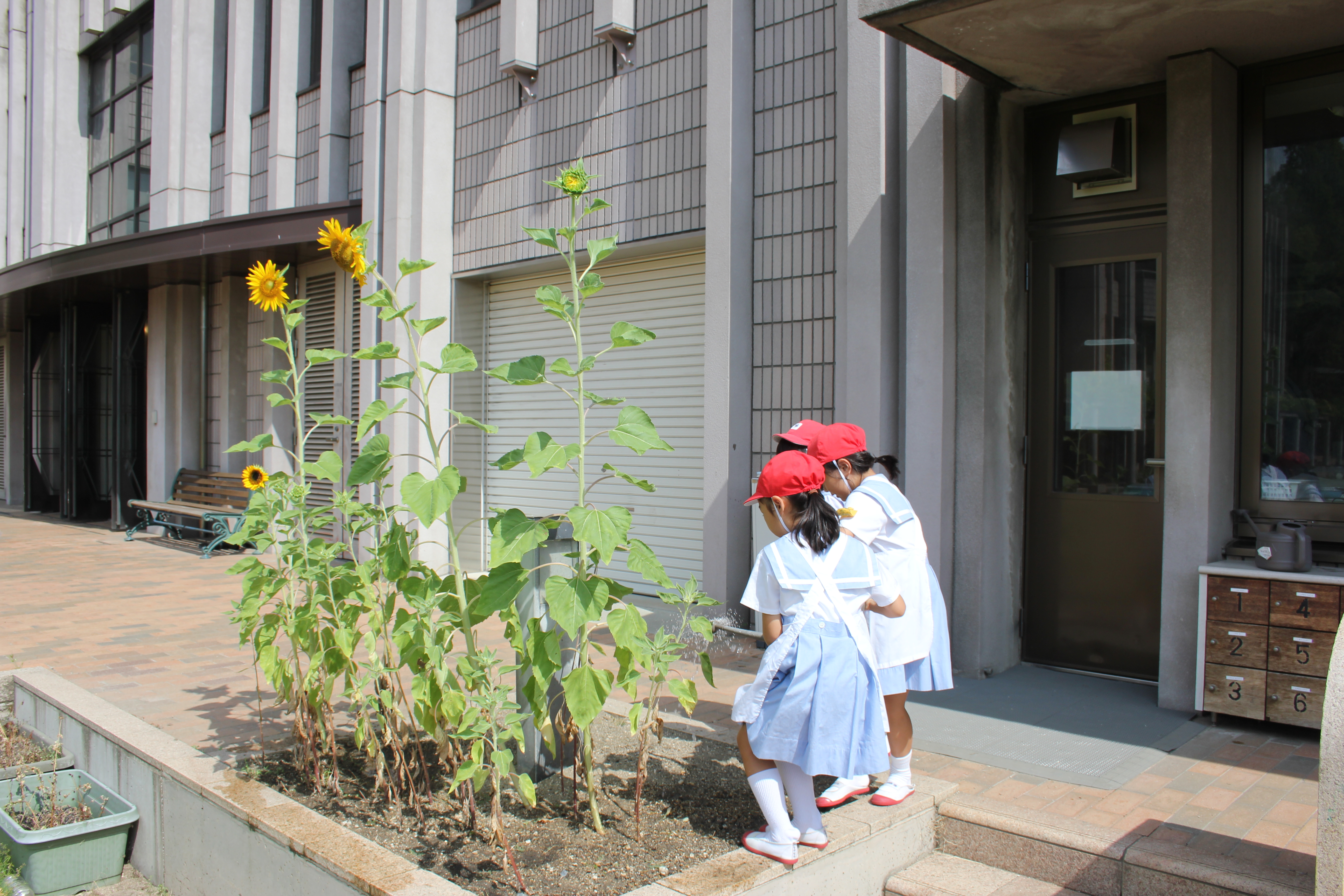 もうすっかり1年生より背の高くなったひまわりですが、厳しい残暑の中で爽やかな様子を見せてくれています。