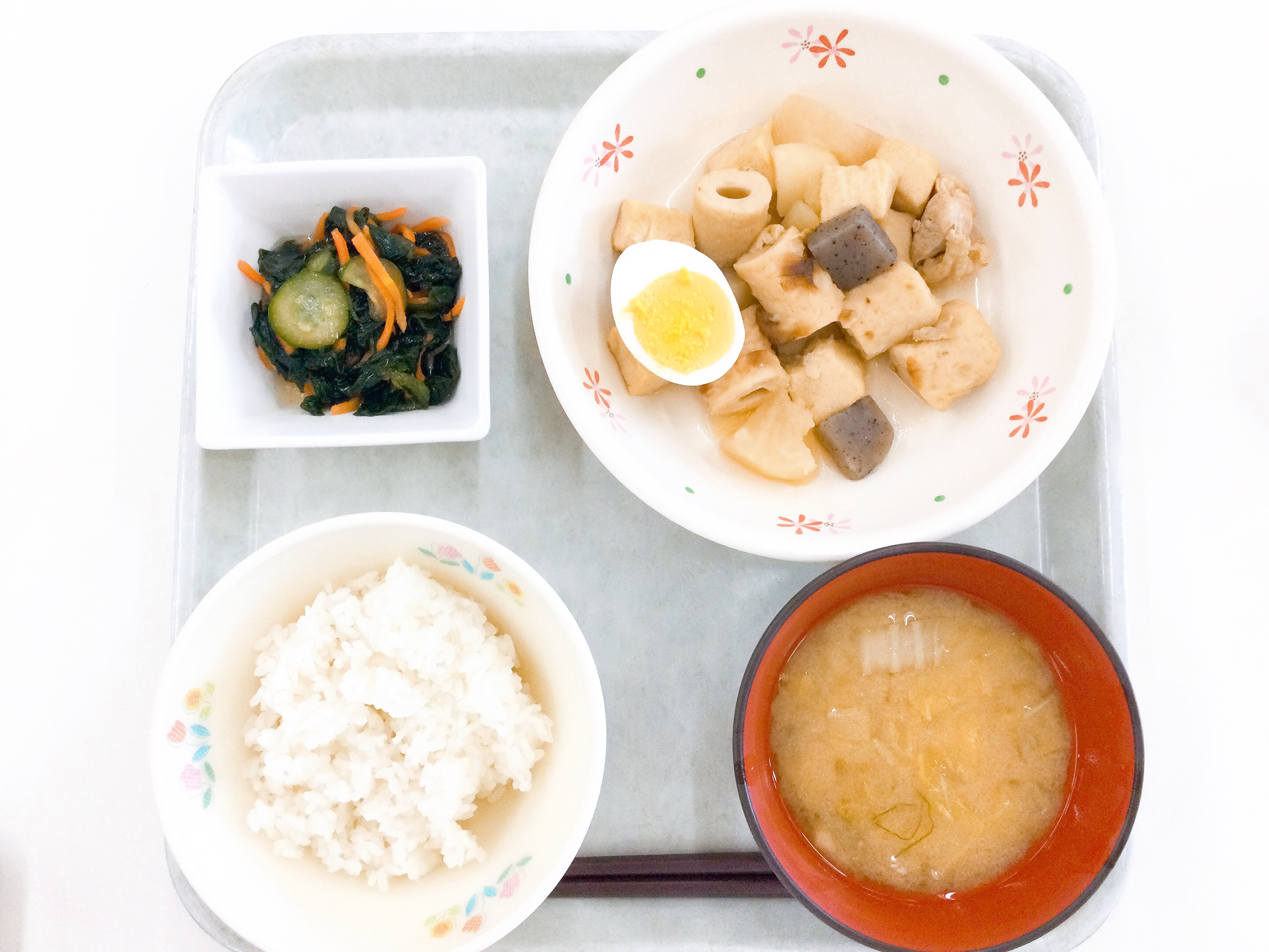 【今日の献立】 ごはん、 さつまいもの肉じゃが、 小松菜とじゃこの炒め物、 切干大根となめこのみそ汁、 ぶどうヨーグルト
