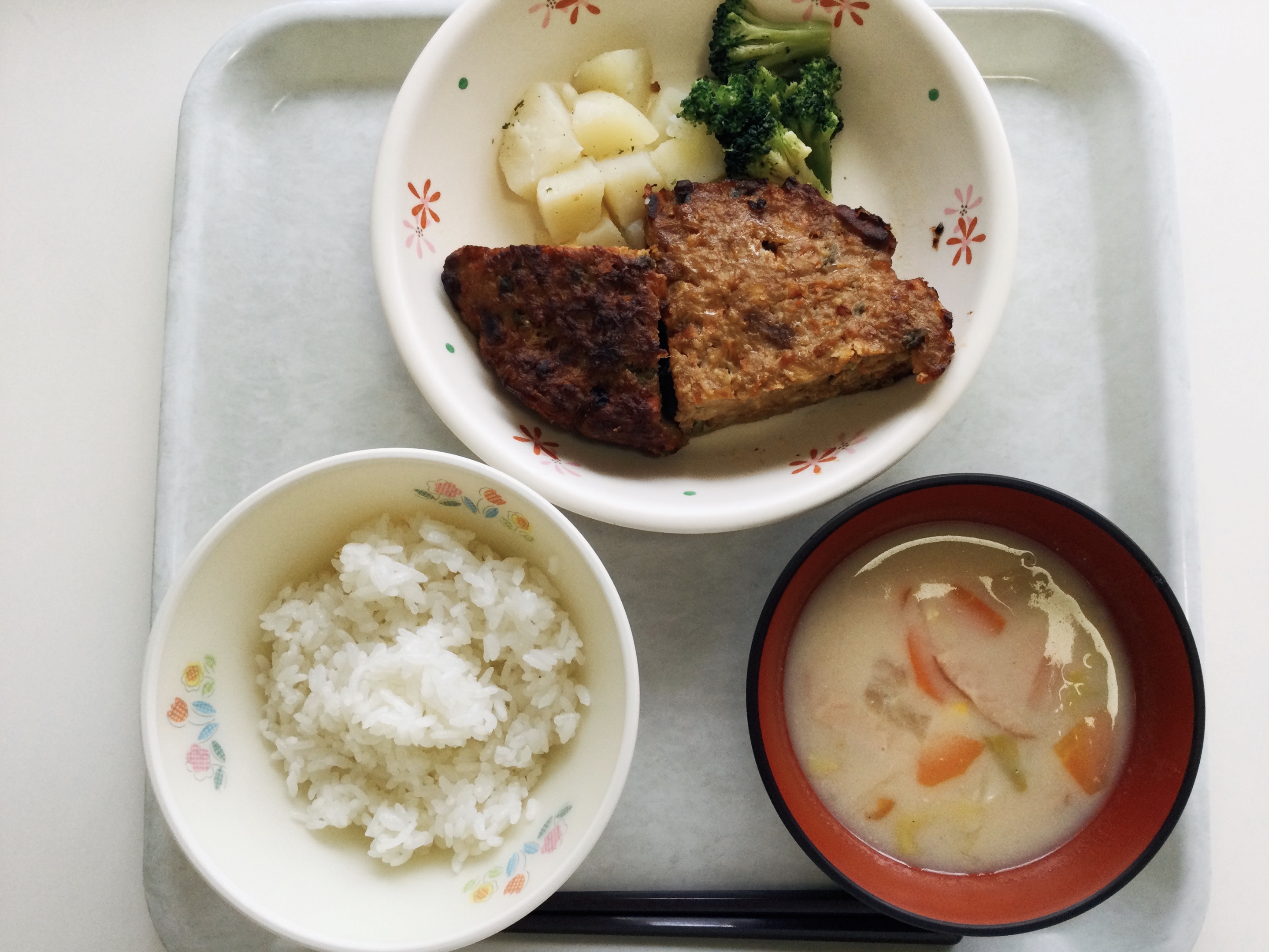 ごはん、 ミートローフ、 小松菜とウインナーのソテー、 ミネストローネ、 フルーツ白玉