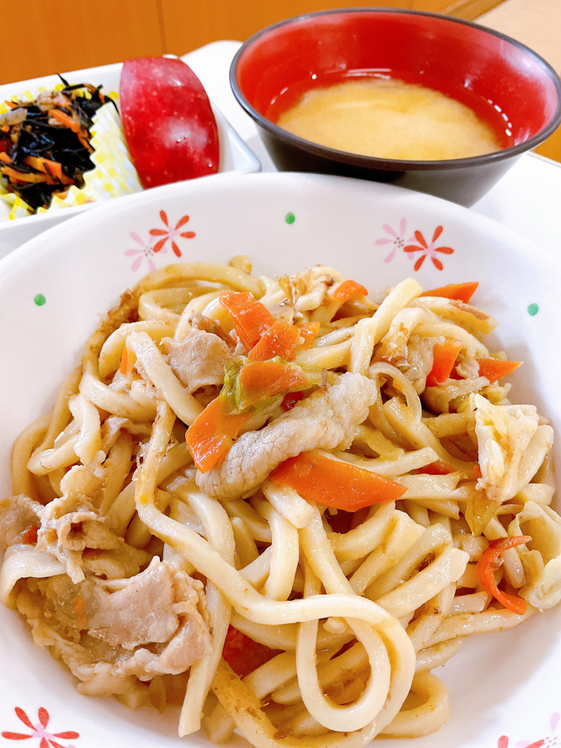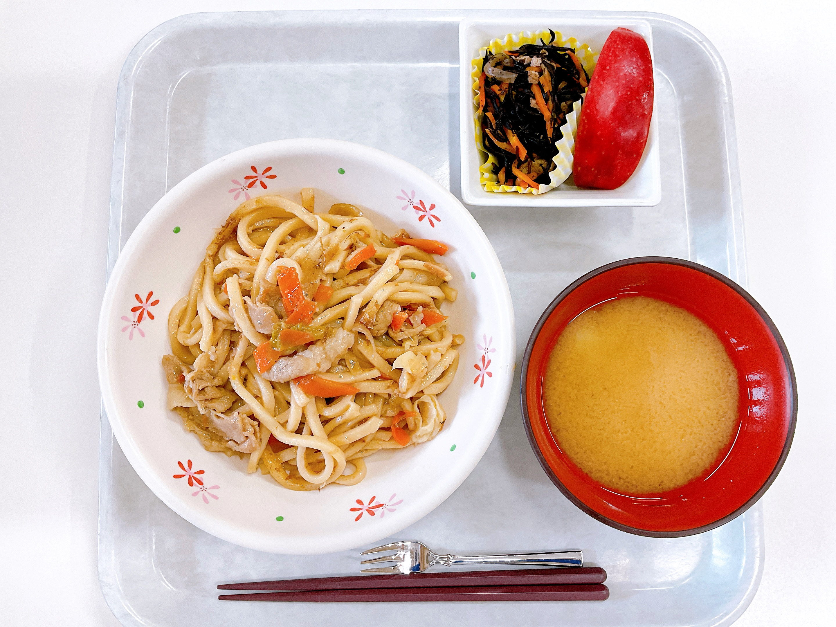 2025年10月10日(金) 和食 焼きうどん 【今日の給食】 焼きうどん、 ひじきと大豆の煮物、 もやしとじゃがいものみそ汁、 りんご りんごは今が旬の果物です。 「1日1個のりんごは万病をふせぐ」という西洋のことわざがあります。 1日1個のりんごを食べるとあらゆる病気を防げるということです。 ビタミン、ミネラル、食物繊維がたっぷりで、おなかの調子を整える効果が期待できます。