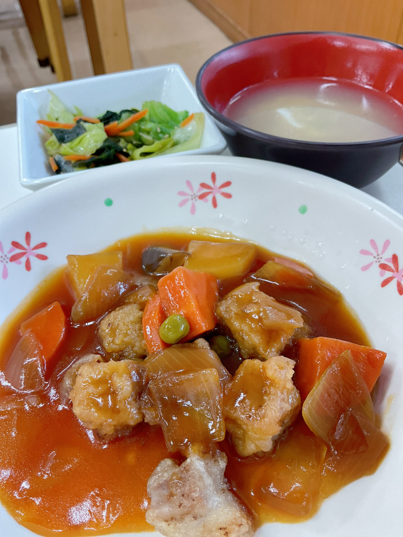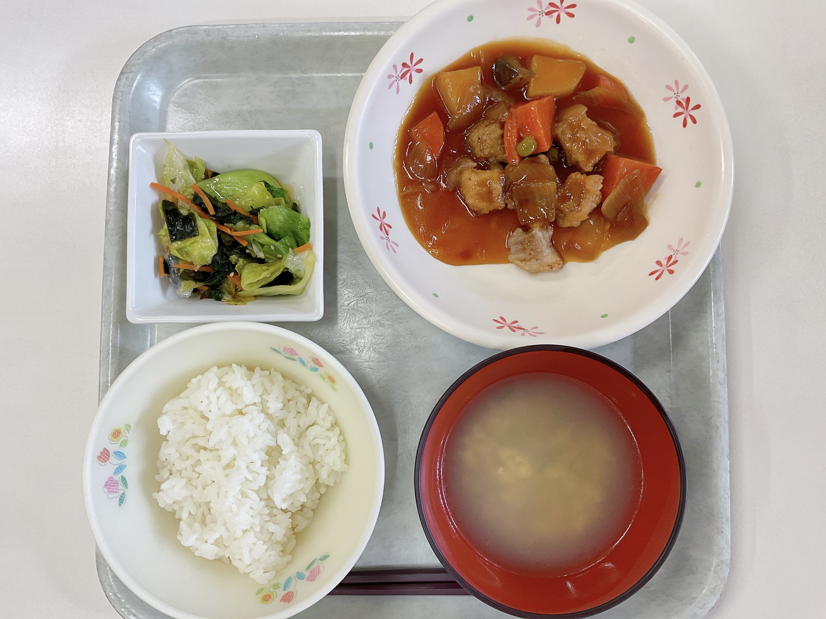 2025年10月15日(水) 中華 酢豚 【今日の給食】 ごはん 酢豚 チョレギサラダ 中華コーン卵スープ 体育大会の練習にはげんでいる皆さん! 酢豚に使われる豚肉にはビタミンB1が多く含まれ、疲労回復に効果があるので、 疲れを感じたときにぴったりのメニューです。