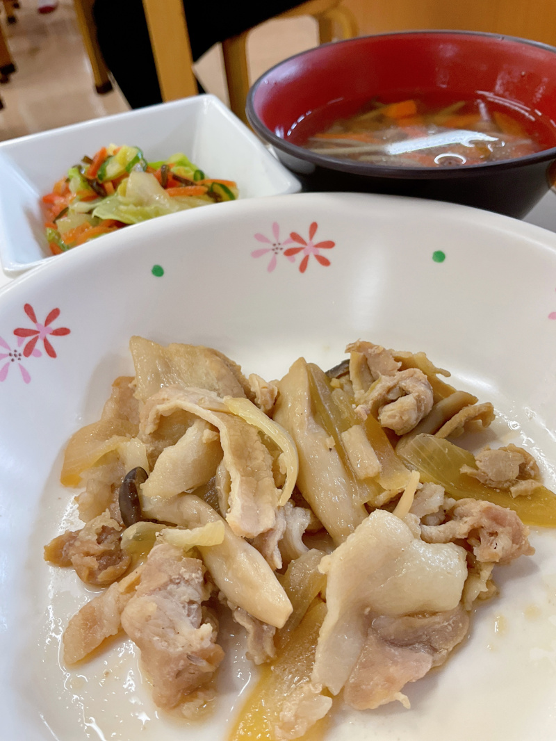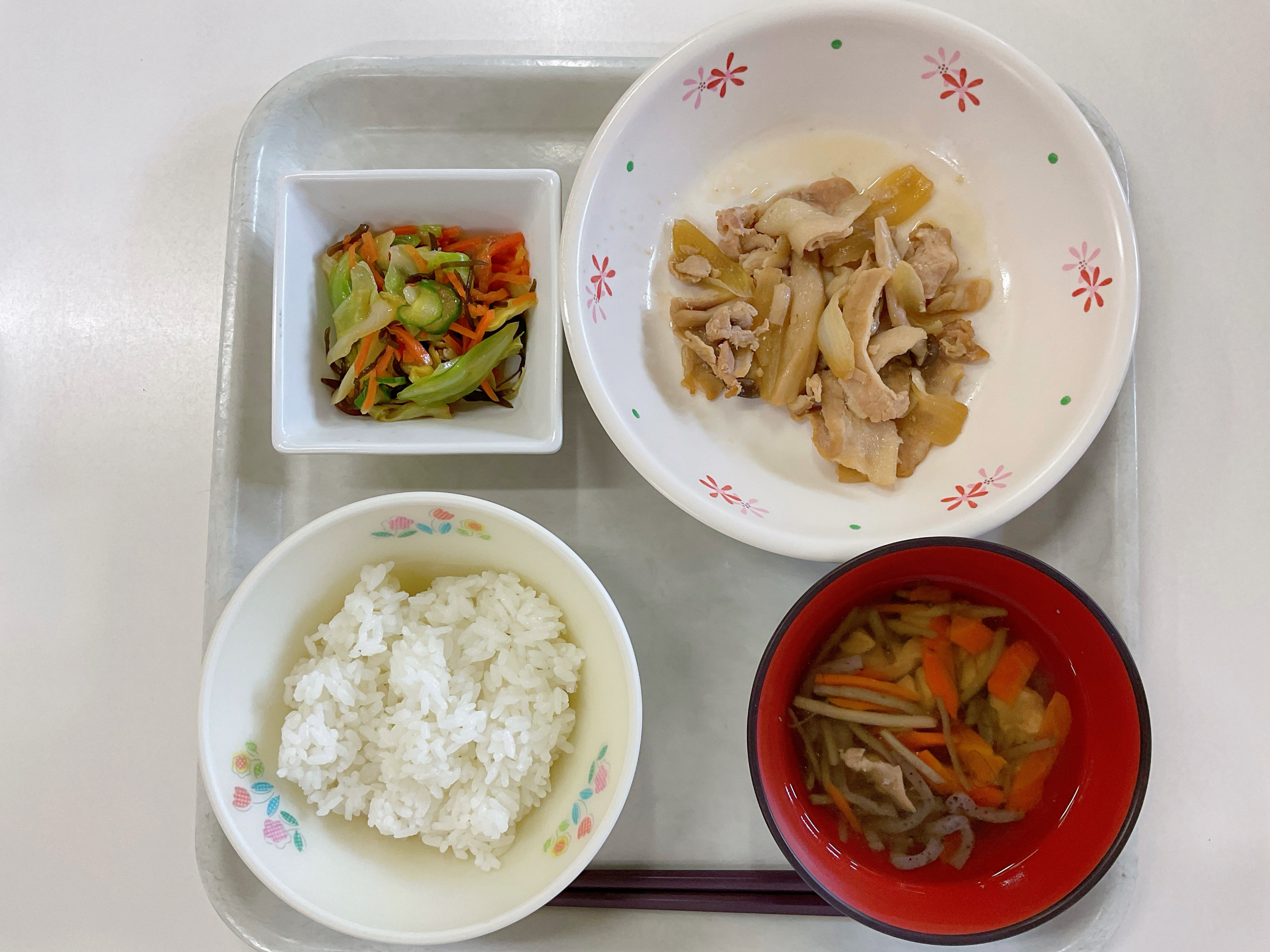 2025年10月16日(木) 和食 豚の生姜焼き 【今日の給食】 ごはん 豚の生姜焼き キャベツと胡瓜の塩昆布サラダ 五目汁 キャベツと胡瓜の塩昆布サラダは、にんじん・きゅうり・キャベツをほどよく茹で、塩昆布とごま油で和えました。 ごま油が味のアクセントとなり、食べやすくなっています。