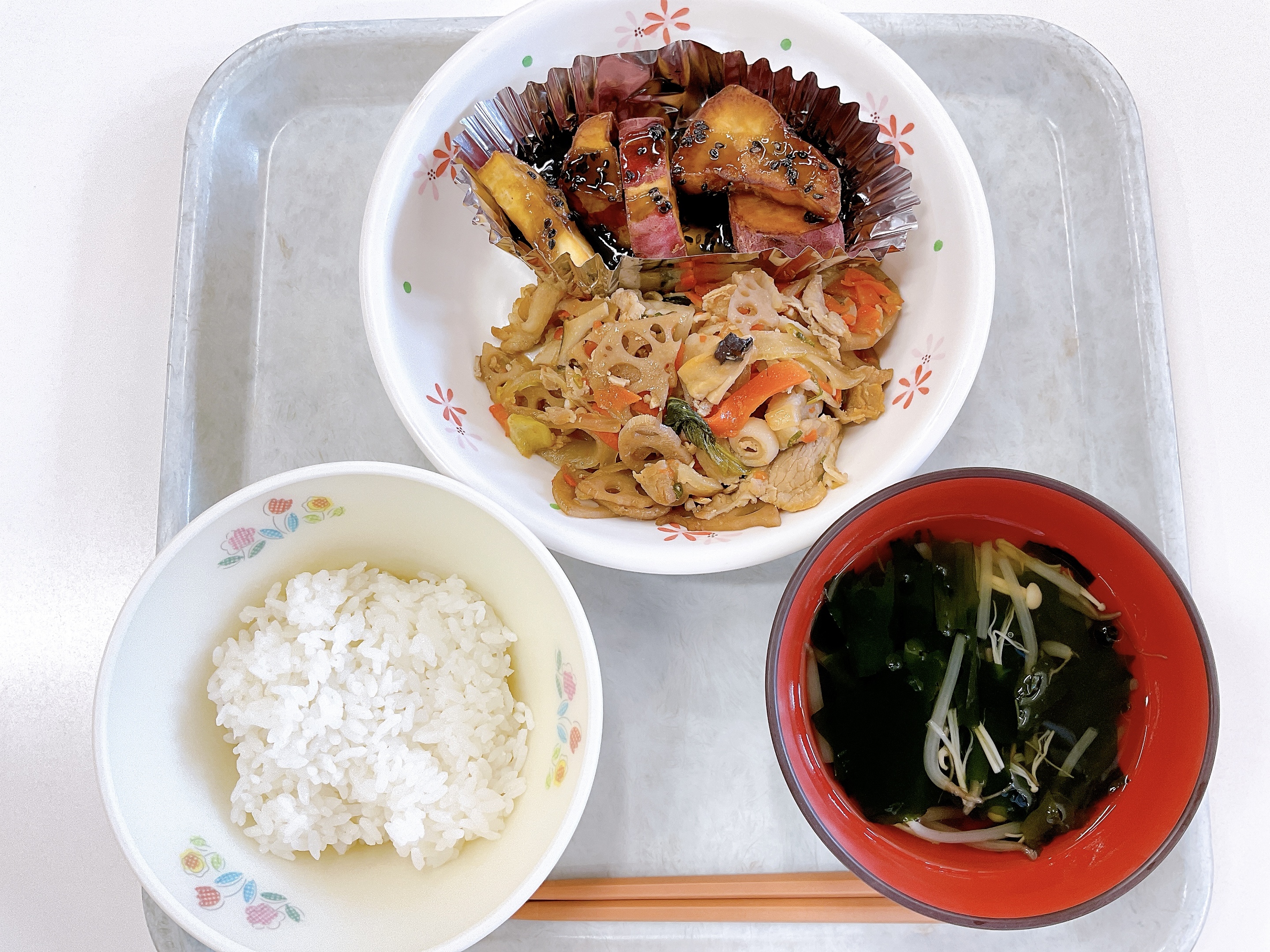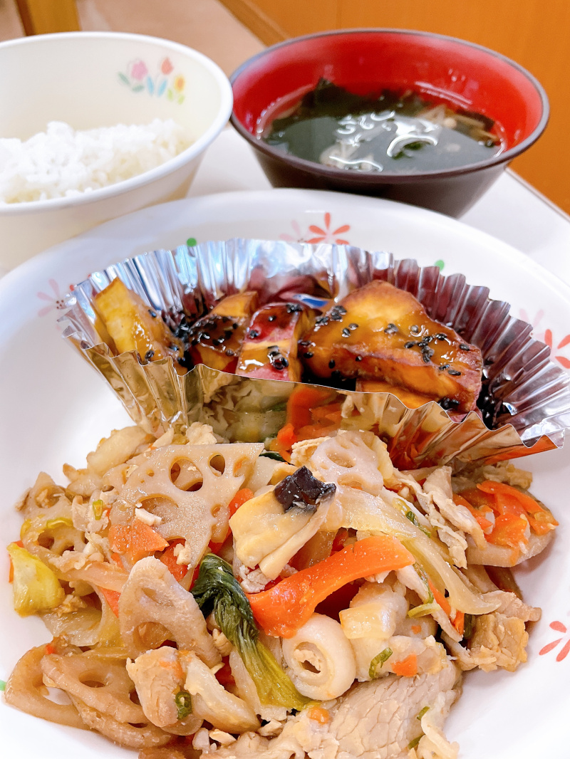 2025年10月30日(木) 和食 豚肉とれんこんの炒め物 【今日の給食】 ごはん 豚肉とれんこんの炒め物 大学いも もやしとわかめのスープ 大学芋の「さつまいも」は秋が旬の食材です。 さつまいもは食物繊維が豊富です。 また、皮が紫なのは、アントシアニンという色素が含まれているためです。 アントシアニン色素は抗酸化作用があります。