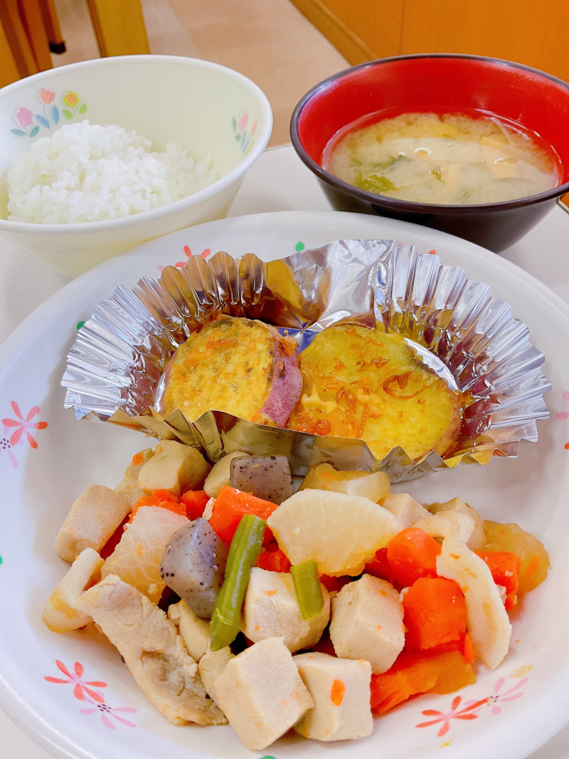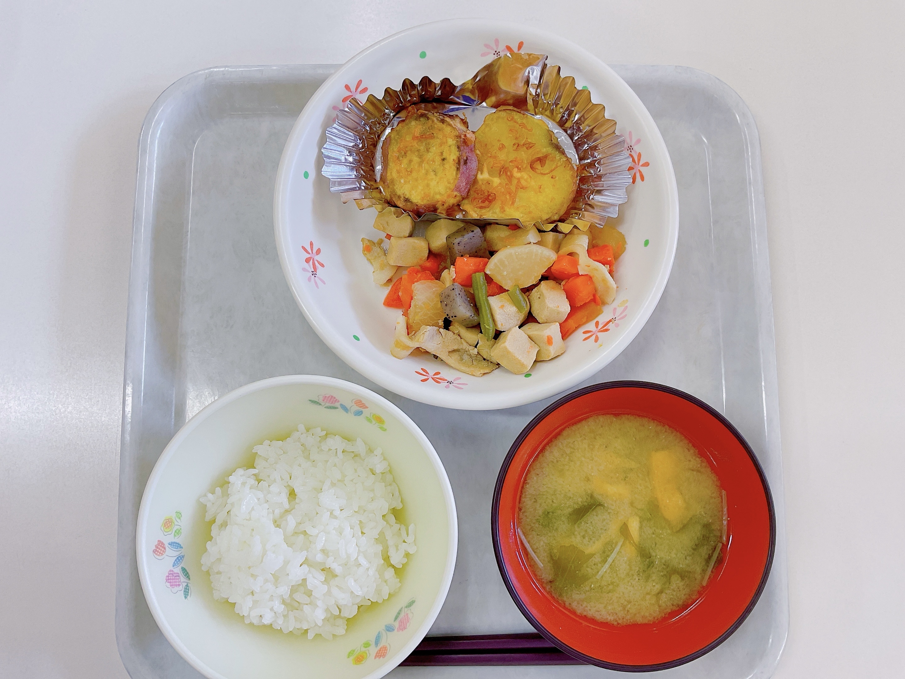 2025年12月09日(火) 和食 豚肉と高野豆腐の炊き合わせ 【今日の給食】 ごはん 豚肉と高野豆腐の炊き合わせ さつまいもの天ぷら 揚げと水菜のみそ汁 今が旬のさつまいもを天ぷらにしました。 ホクホクして甘味も増して美味しいですよ。
