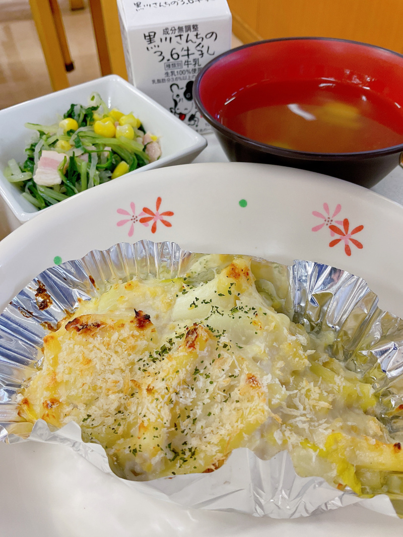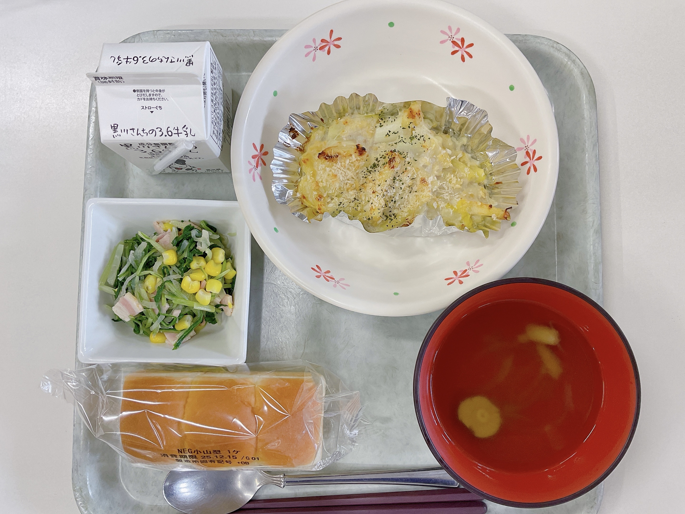2025年12月12日(金) 洋食 白菜とじゃがいものグラタン 【今日の給食】 NEG丸ロール60g 白菜とじゃがいものグラタン 水菜サラダ たまねぎとしめじのコンソメスープ 牛乳 白菜は今が旬の野菜です。 みずみずしい白菜を今日はグラタンにしました。 水菜サラダは、こちらも今が旬の水菜を、ベーコンと、ゆず果汁の風味がするドレッシングで和えました。