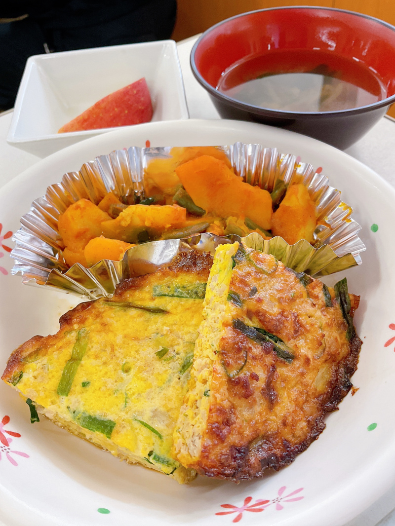 2025年12月18日(木) 中華 餃子オムレツ 【今日の給食】 ごはん 餃子オムレツ 南瓜といんげんのカレー炒め もやしとわかめの中華スープ りんご 餃子のような中華オムレツ「餃子オムレツ」。 ニラの香りと切干大根の歯ごたえがアクセントです。