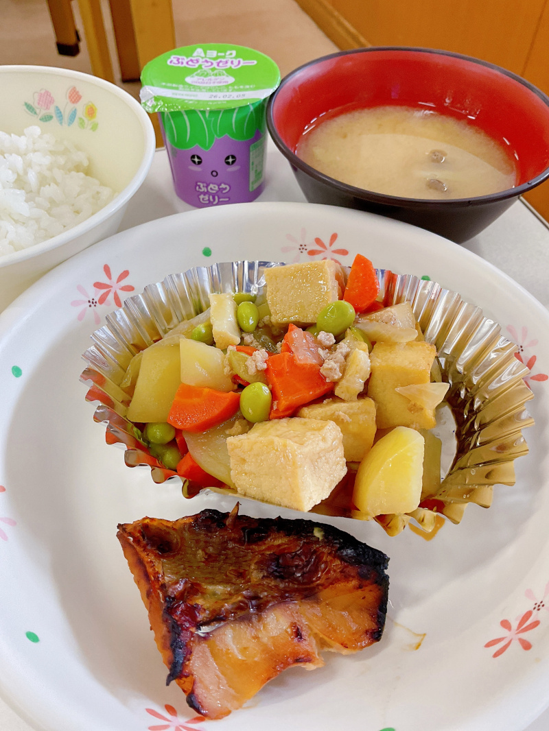 2026年01月20日(火) 和食 赤魚のしょうゆ麹焼き 【今日の給食】 ごはん 赤魚のしょうゆ麹焼き 厚揚げと野菜のそぼろ煮 繊維たっぷりみそ汁 ぶどうゼリー 繊維たっぷりみそ汁には、キャベツ、こんにゃく、えのき、もやしといった不溶性食物繊維が多い食材が入っています。 お腹のお掃除をしてくれ、体の調子を良くしてくれます。 残さず食べましょう。