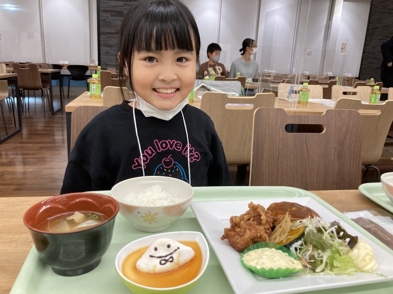 続いての夕食タイムに登場したのは、学食の人気メニュー「学食人気メニューの手作りハンバーグと唐揚げ、具だくさん味噌汁、マシュマロお化けのプリン」です。デザートのプリンに描かれたお化けは1つ1つ表情が違って、子どもたちに大好評。皆の「おいしい!」の声が学食に響いていましたよ。