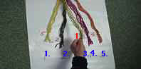 7. くりかえし同じことをしていきます。5の 糸をとり2のところへ、続いて1の糸を3 のところへ、そして2の糸を3のところへ 移動します。 |