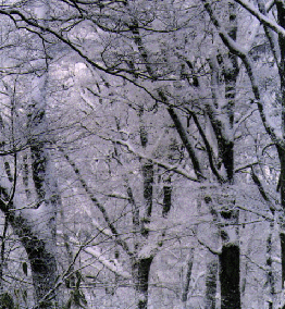 葉を落とした冬の木々に雪が吹き付けられて白黒の濃淡が美しく現われます。